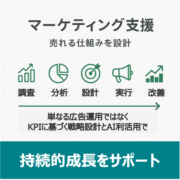 Maloco Internationalのマーケティング支援は、単なる広告運用や施策代行ではなく、経営に直結する「売れる仕組み」を設計します。市場調査や競合分析で機会を発見し、最適なターゲット像を設計。KPIに基づいた戦略を描き、広告・SNS・コンテンツを実行しながら効果を数値で検証し改善します。さらに生成AIを活用することで、スピードと精度を両立し、持続的な成長をサポートします。